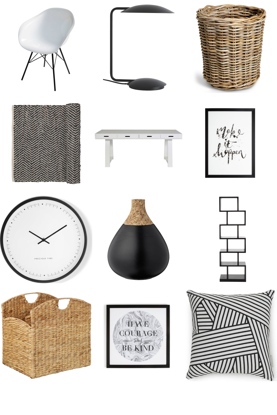 A stylish, modern monochrome office. Black and white décor with natural look rattan and water hyacinth accessories to create some warmth and colour contrast. Plus some inspirational wall art to keep you motivated!